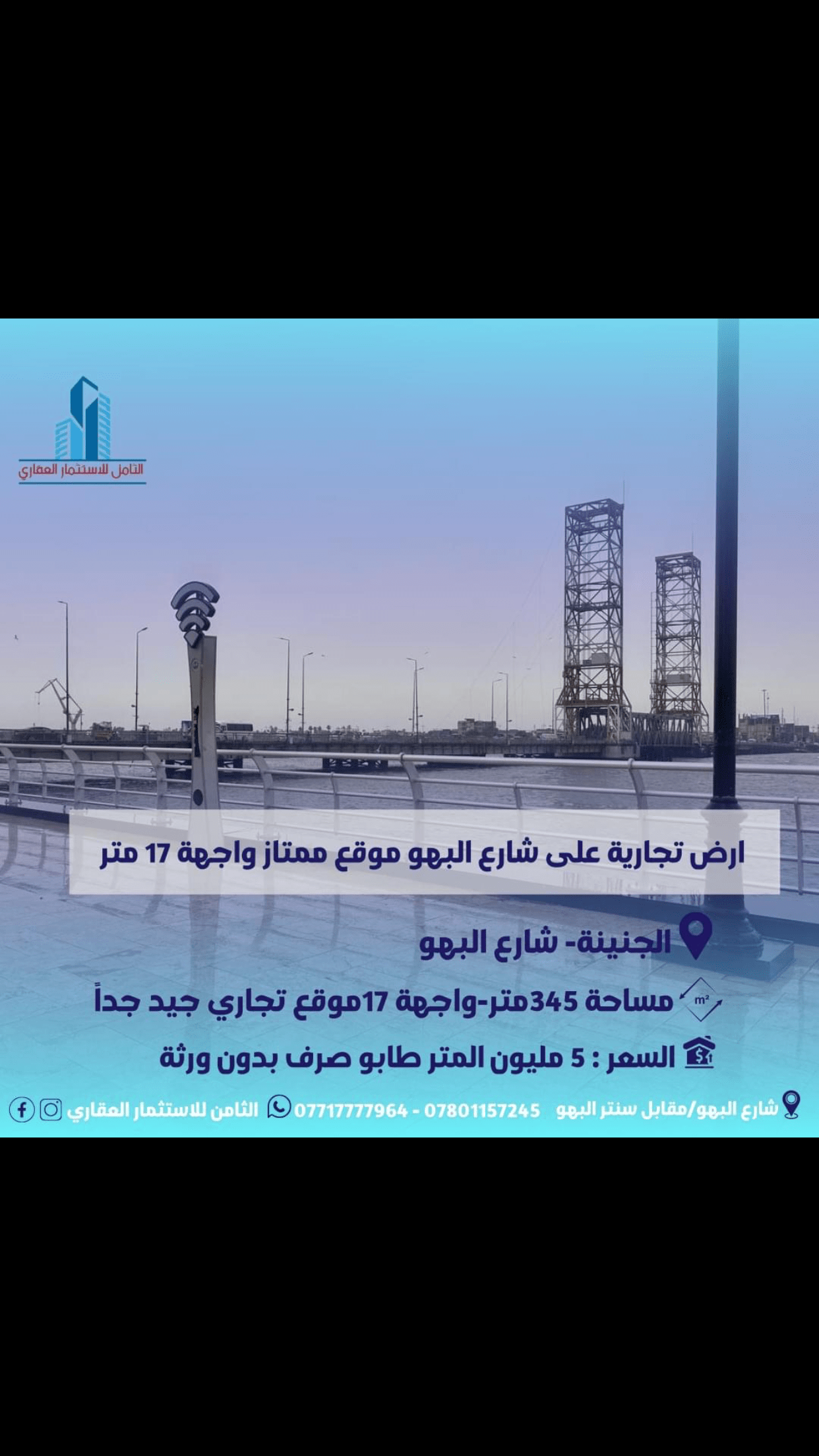 أرض تجارية(طابو صرف بدون ورثة)للبيع في البصرة،على شارع البهو (٣٤٥م²)الواجهة١٧م السعر للمتر ٥ مليون دينار
