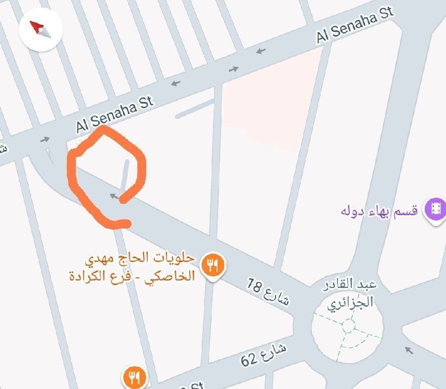 قطعه تجاريه للبيع في الكراده مساحه 397متر واجهه 10.20 نزال 38 ركن قرب الخاصكي شارع الصناعه
