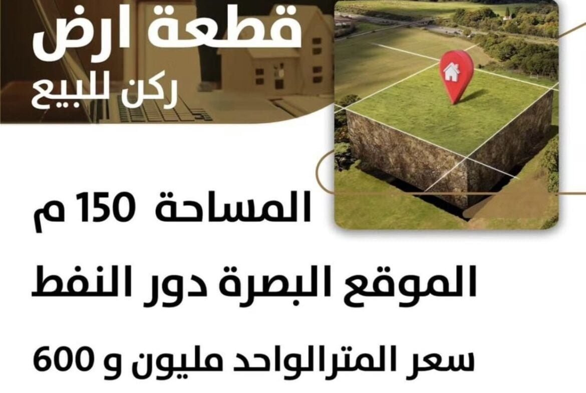 أرض ركن للبيع في البصرة،دور النفط (١٥٠م²) السعر المتر ١,٦٠٠ مليون دينار