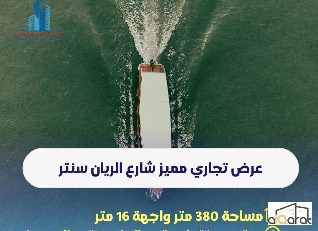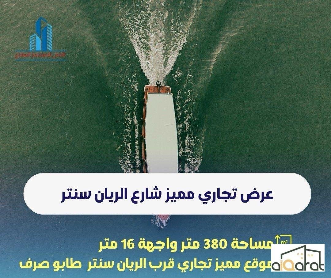 عرض تجاري مميز شارع الريان سنتر٬ طابو صرف٬ موقع مميز تجاري قرب الريان سنتر٬ مساحة ٣٨٠ متر٬ واجهة ١٦ متر