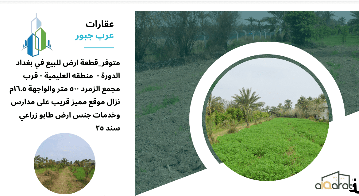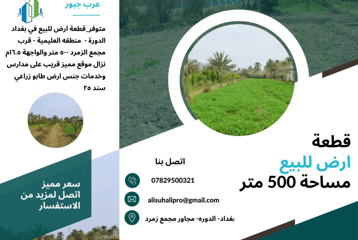 أرض زراعي سند ٢٥ للبيع في الدورة٬منطقة عرب جبور بالقرب من مجمع الزمرد٬ ٥٠٠متر والواجهة ١٦٬٥متر نزال٬ جنس الارض طابو زراعي٬ السعر ٤٥مليون دينار
