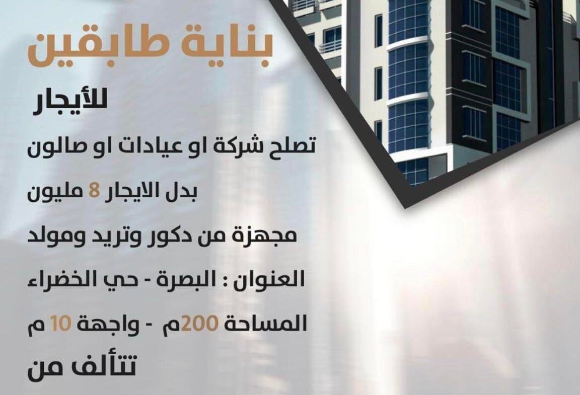 بنايةطابقين تجارية للأيجارفي البصرة،حي االخضراء(٢٠٠م²)الواجهه ١٠م تتصلح شركه اوعيادات اوصالون تتألف من طوابق مفتوحة ومطبخ صحيات مجهزه من ديكور وتبريد ومولد الايجار الشهري ٨ مليون دينار