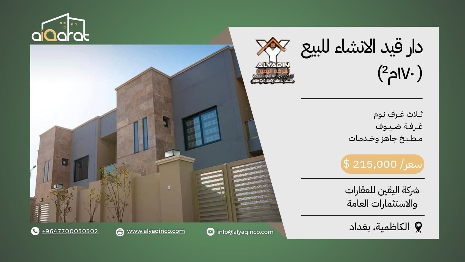 دار قيد الانشاء للبيع في مجمع بوابة الكاظمية الجديد (١٧٠م²) السعر ٢١٥٬٠٠٠دولار