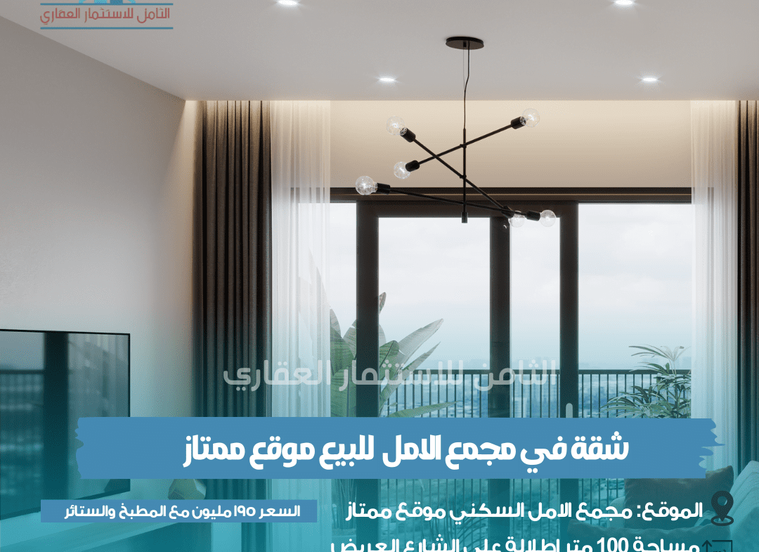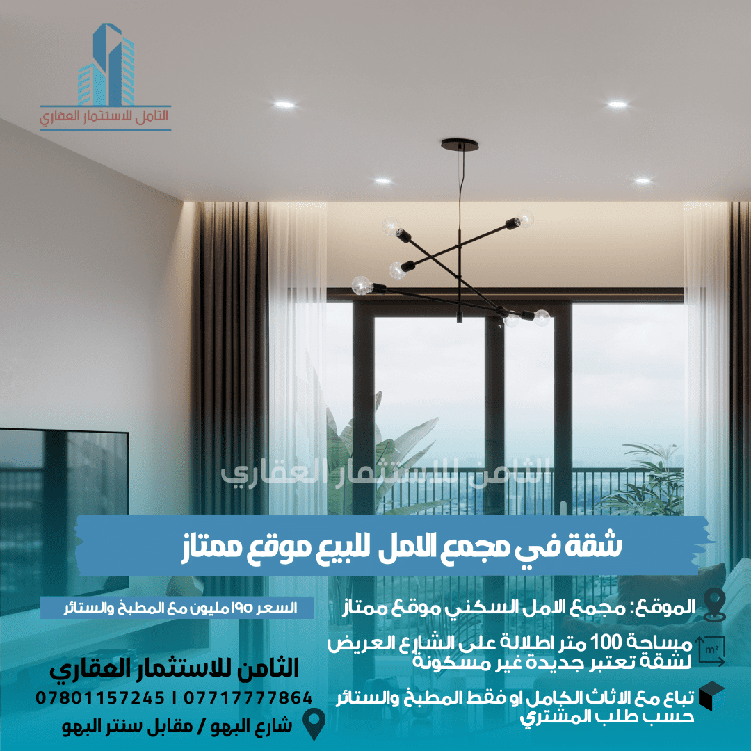 شقة في مجمع الامل ١ للبيع موقع ممتاز ١١٠ متر موقع ممتاز اطلالة على الشارع العريض تباع مع الاثاث الكامل او فقط المطبخ والستائر حسب طلب المشتري الشقة تعتبر جديدة غير مسكونة السعر ١٩٥ مليون مع المطبخ والستائروللأستفسار عن بقية التفاصيل ارجو التواصل حصراً على الرقم اتصال او واتساب :
