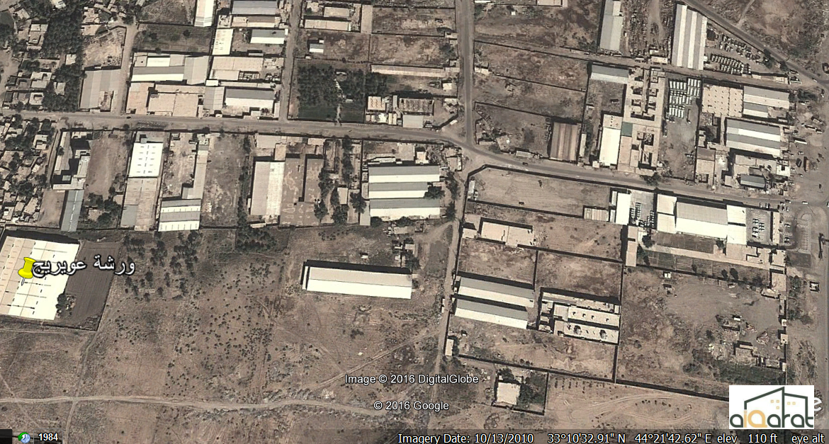 موقع صناعي في منطقة عويريج الصناعية ( خلف قرية المسافر ) , مساحة الارض ( 5 دونم ) الابعاد ( الواجهة = 125 م × الطول = 100 م ) , مشيد عليها سقائف مساحتها بحدود ( 6000 م2 ) تصلح لمشروع صناعي او مشروع مخازن . سند 25 , ( تقع ضمن التصميم الخاص لمنطقة عويريج الصناعية – مصدق ( 566 ) – استعمال مفتوح ) . الموقع يبعد ٧٥٠ متر عن طريق بغداد – الحلة , فتحة شركة تويوتا .السعر ( مليارين وخمسمئة مليون دينار ) قابل للتفاوض .